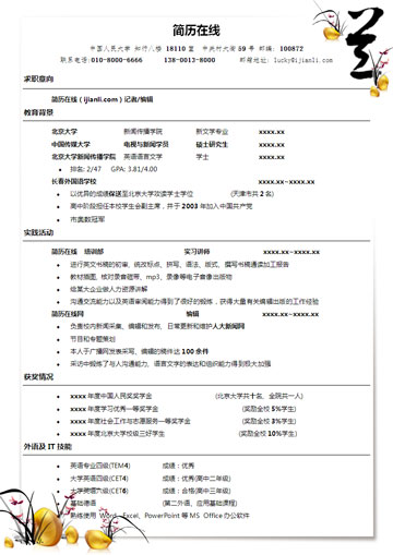 一款带有漂亮背景的经典格式简历模板。以简单的兰花图案做妆点,起到了画龙点睛的作用,但又不喧宾夺主。可以给简历阅读者留下深刻的印象。