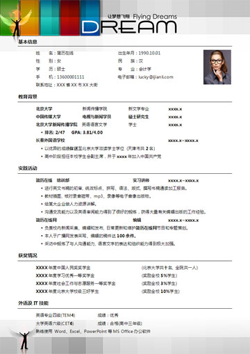 以梦想为主题的Word个人简历模板,突出求职者的追求与理想。适合各专业求职人才使用。简历内容随意修改,带有自荐信模板,高清晰的300dpi打印分辨率,保证打印质量与效果。
