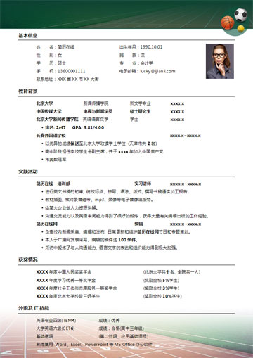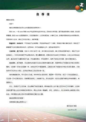非常适合体育类专业使用的Word简历模板,比如体育老师,运动员等等,跑道与球类的组合预示永无止境的拼搏精神。