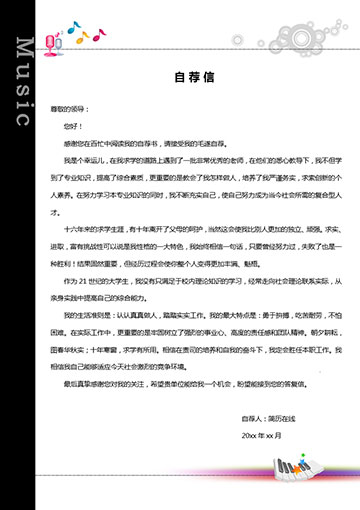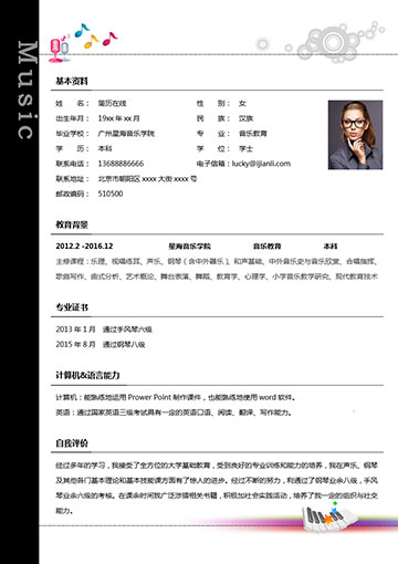 一款专为音乐艺术类专业毕业生制作的求职简历模板。