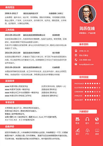 经典的排版模式,活泼大方的颜色搭配,使整个简历看起来生动有序。适合商务、设计等专业人士使用。
