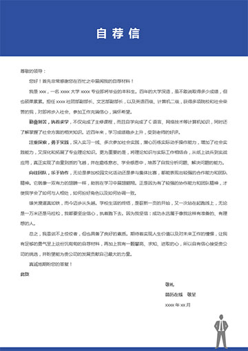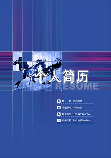 取名蓝色无疆,封面大面积的蓝色配以骏马奔驰,无疆无界,任君自由驰骋,发挥才能。配有自荐信。