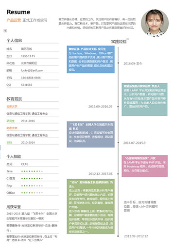 按时间轴排序,拥有丰富的色彩,增强简历的视觉冲击力,白色背景使整个简历看上去干净整洁。非常适合技术、设计类求职者使用。