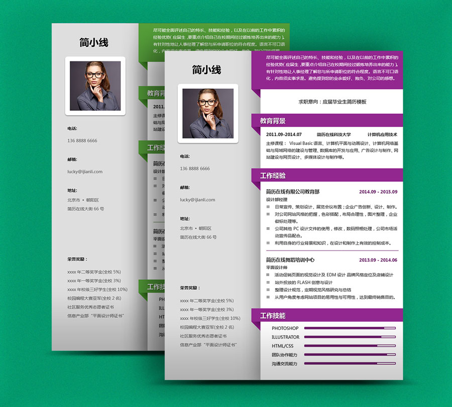 所下载的简历模板均可以全元素修改,编辑。全元素是指模板的所有内容,如文字、标题、图标、背景色、照片等等,这些均可以做添加、删除、复制、修改、替换等动作。