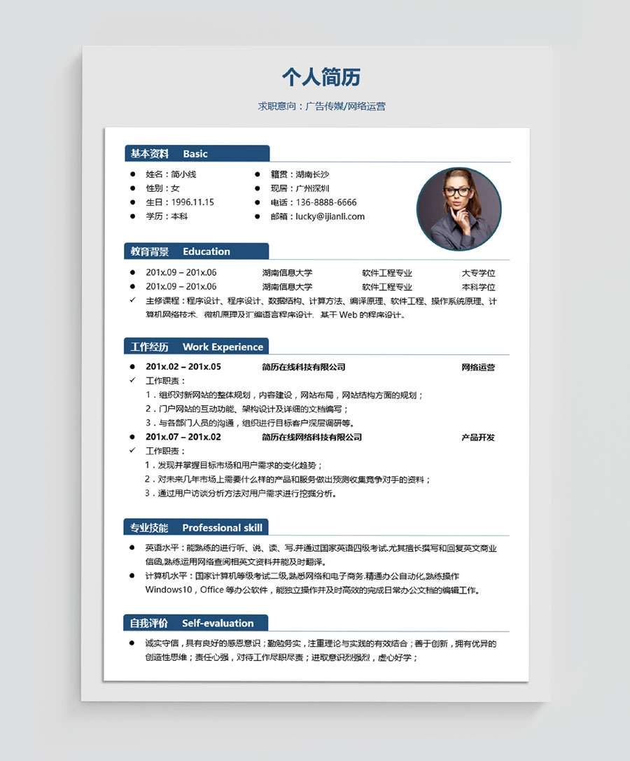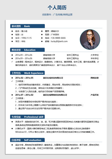 简洁风格网站运营个人简历模板(JD10225)