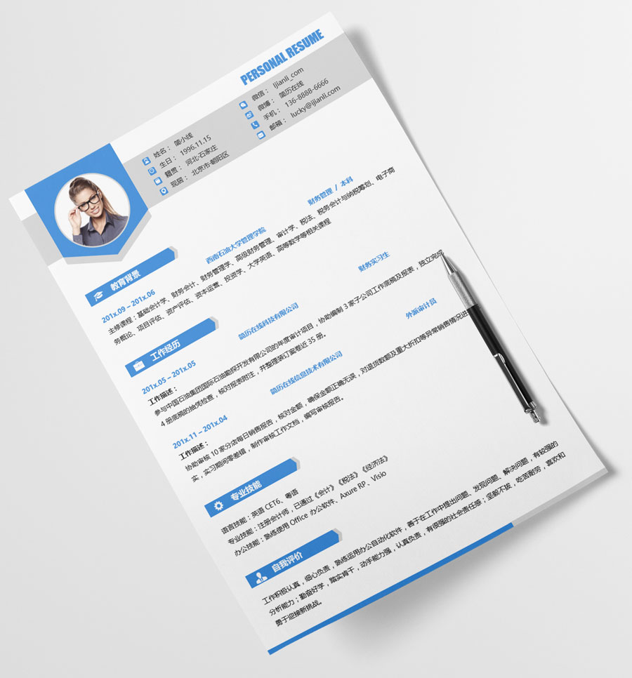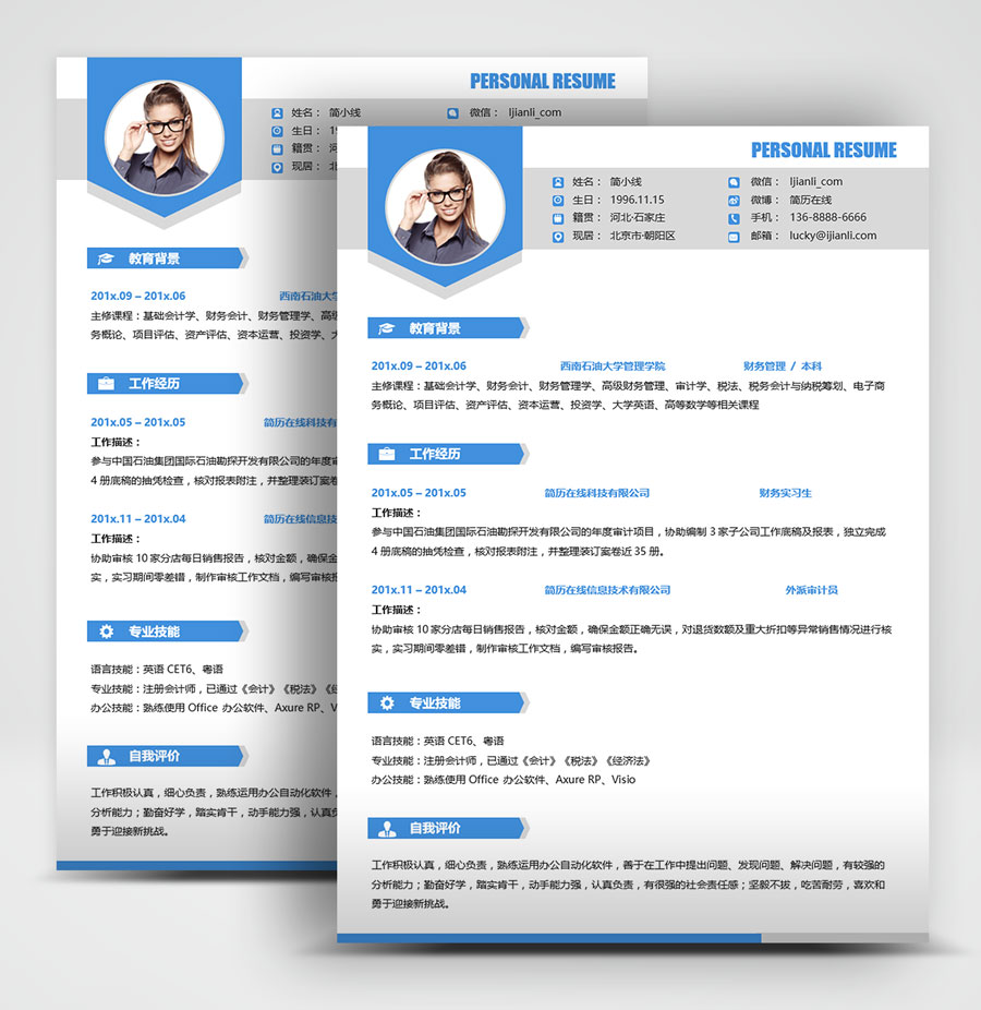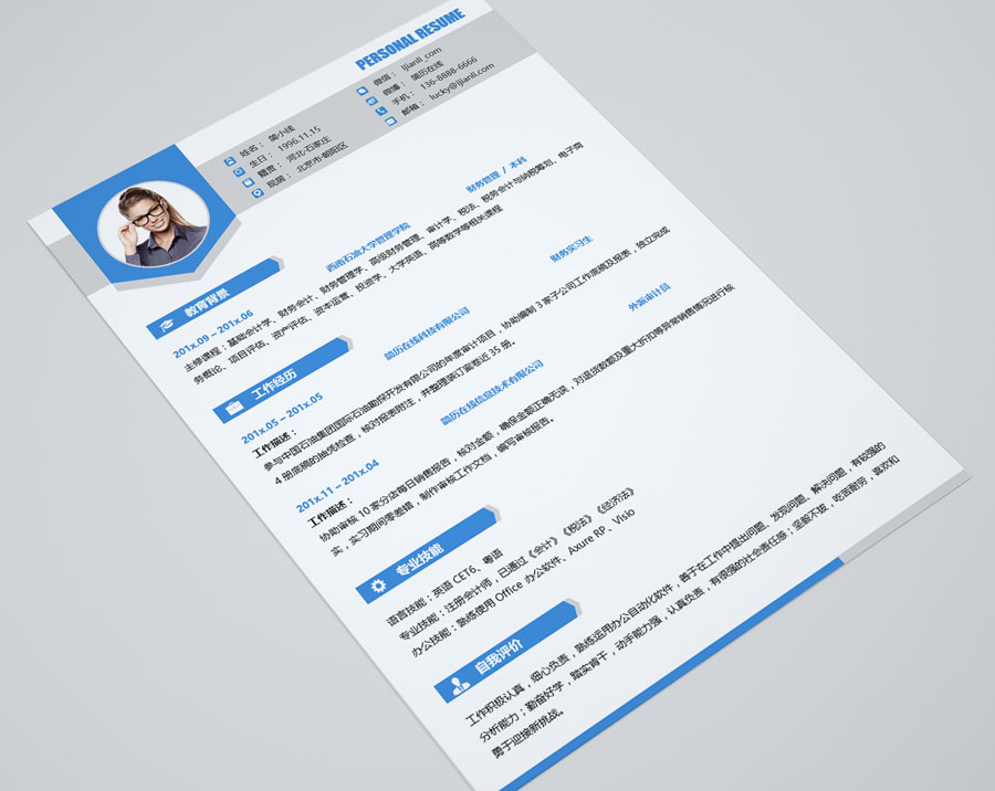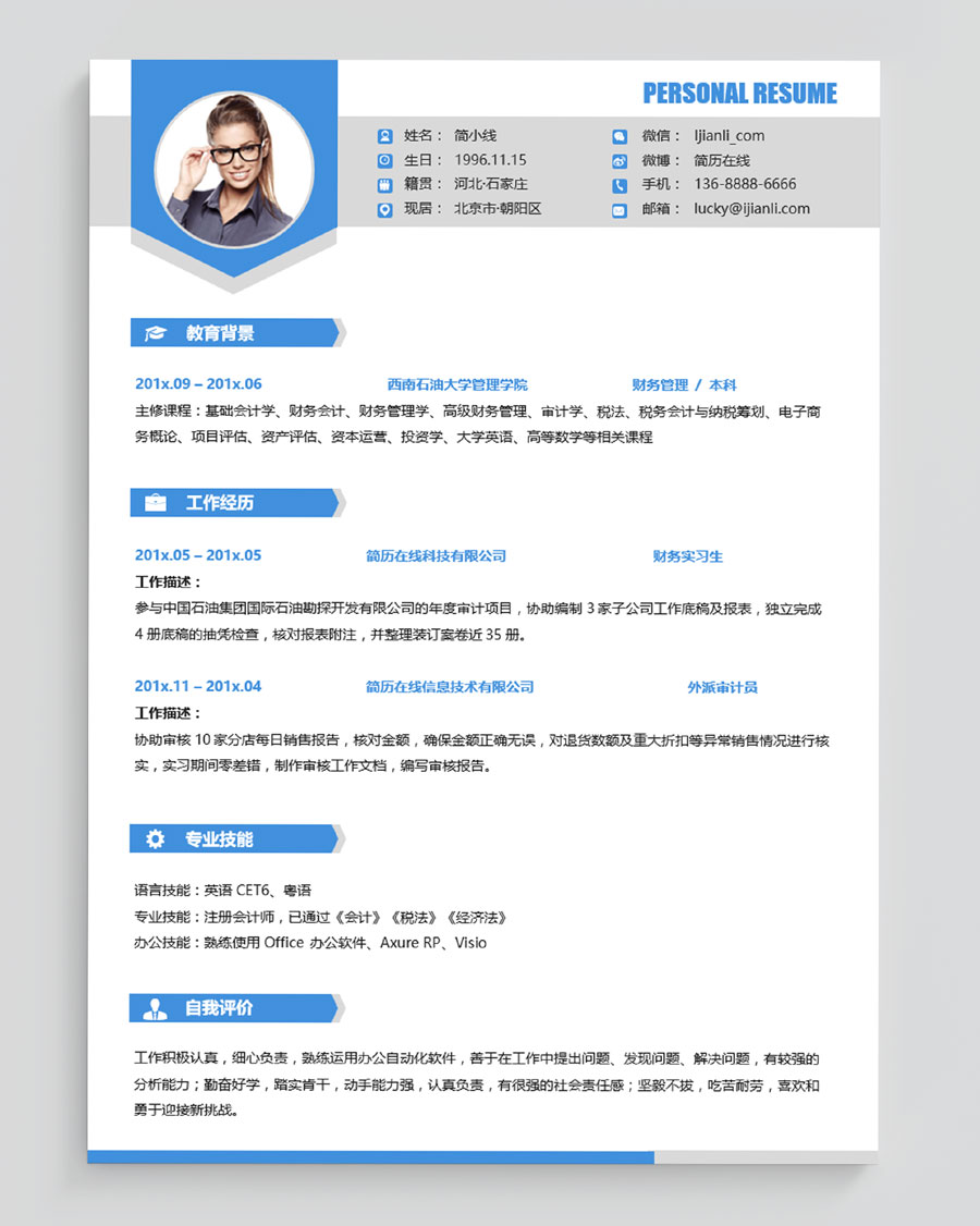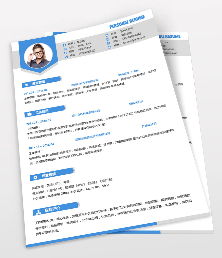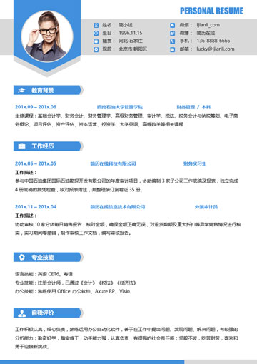 清爽蓝财务类个人简历模板(JD10288)
