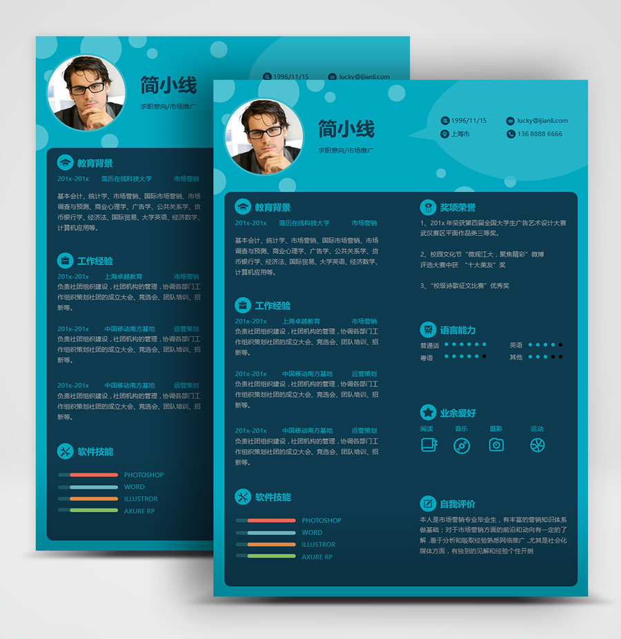 所下载的简历模板均可以全元素修改,编辑。全元素是指模板的所有内容,如文字、标题、图标、背景色、照片等等,这些均可以做添加、删除、复制、修改、替换等动作。
