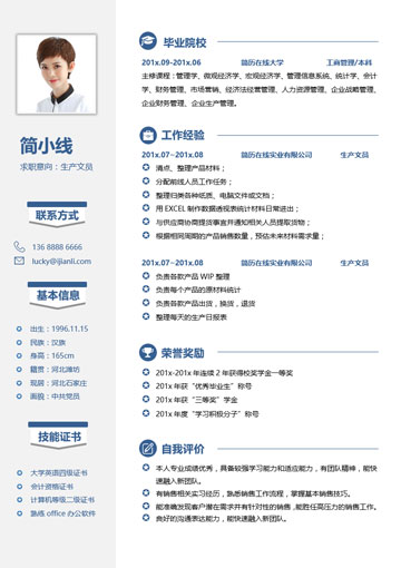 生产文员个人简历模板(JD10301)