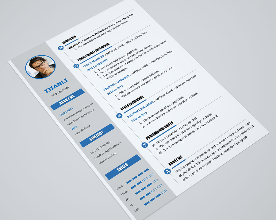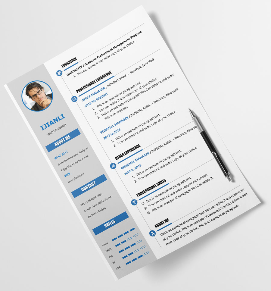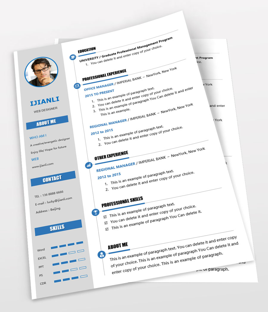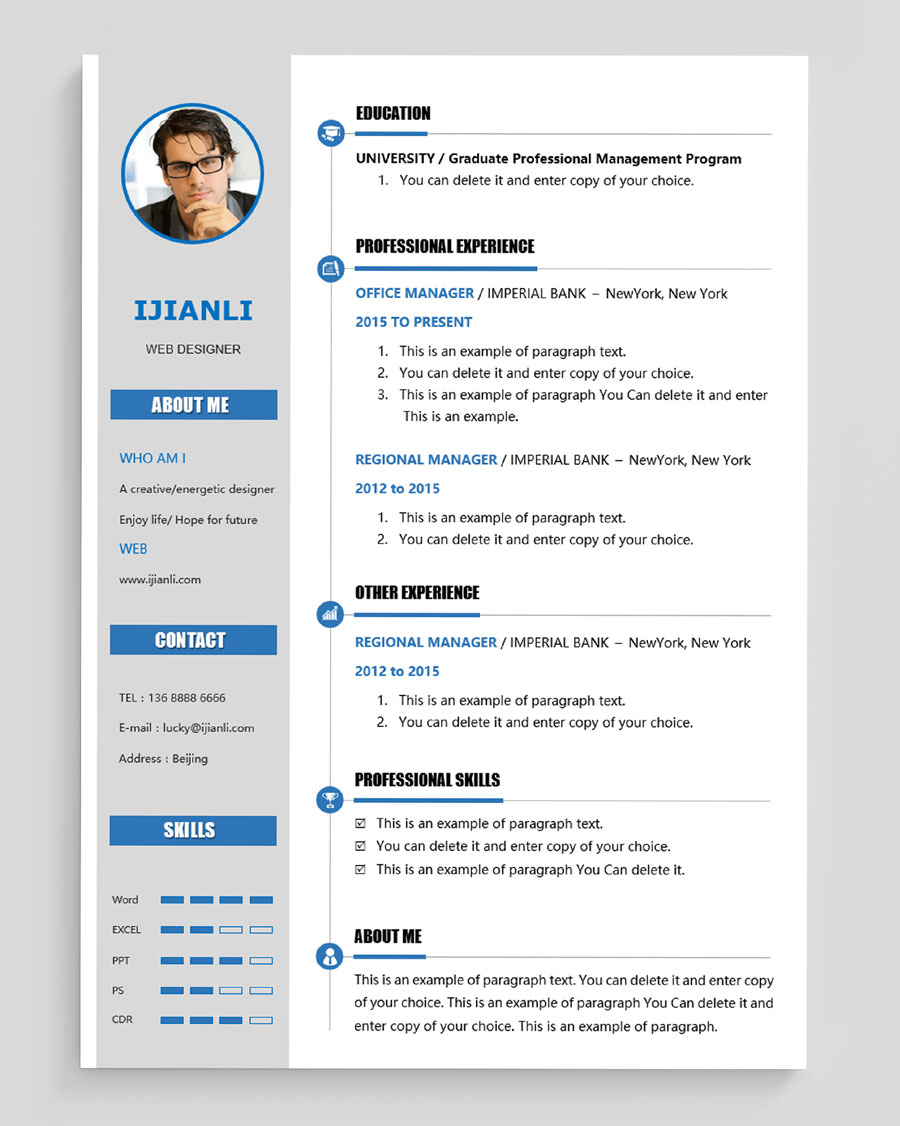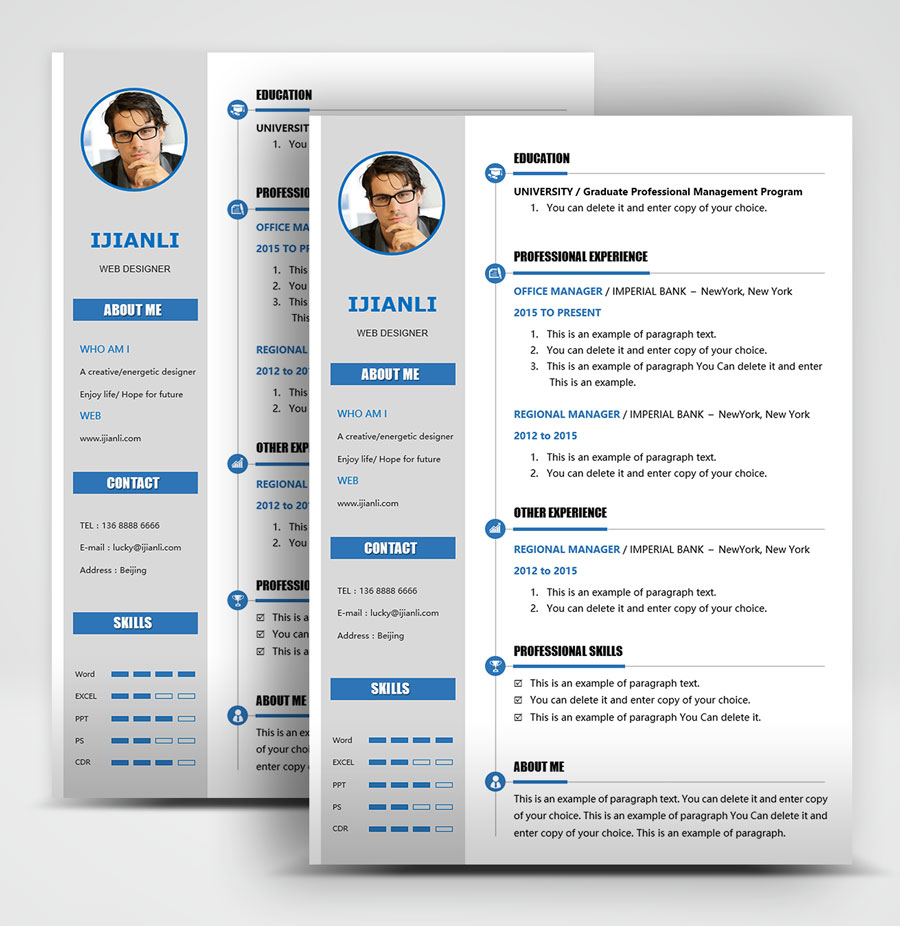 所下载的简历模板均可以全元素修改,编辑。全元素是指模板的所有内容,如文字、标题、图标、背景色、照片等等,这些均可以做添加、删除、复制、修改、替换等动作。