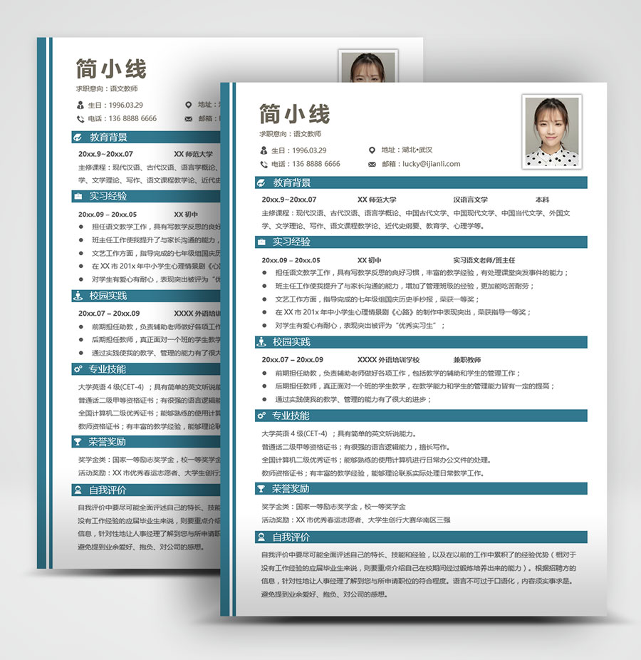 所下载的简历模板均可以全元素修改,编辑。全元素是指模板的所有内容,如文字、标题、图标、背景色、照片等等,这些均可以做添加、删除、复制、修改、替换等动作。