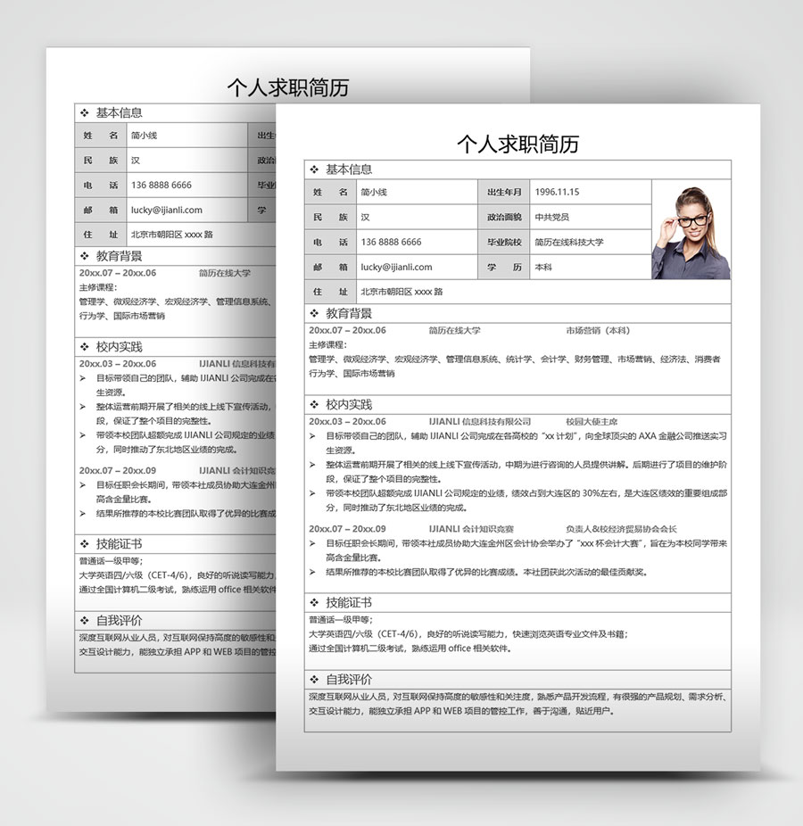 所下载的简历模板均可以全元素修改,编辑。全元素是指模板的所有内容,如文字、标题、图标、背景色、照片等等,这些均可以做添加、删除、复制、修改、替换等动作。