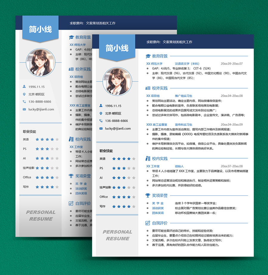 所下载的简历模板均可以全元素修改,编辑。全元素是指模板的所有内容,如文字、标题、图标、背景色、照片等等,这些均可以做添加、删除、复制、修改、替换等动作。